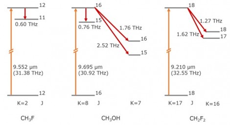 Figure 5: Laser transitions of three molecules used in THz lasers. K and J are quantum numbers defining the rotational state of the molecule. Adapted from Ref 2. Pump frequencies from Ref 3.