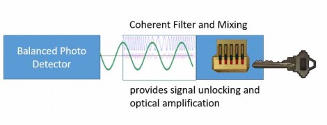 This diagram illustrates the concept of coherent amplification. The local oscillator, branched off from the blue transmit signal, interferes constructively with the weak purple receive signal and generates a new green strong beat frequency signal. The strong beat frequency signal is then fed back into and detected by the photodetector.