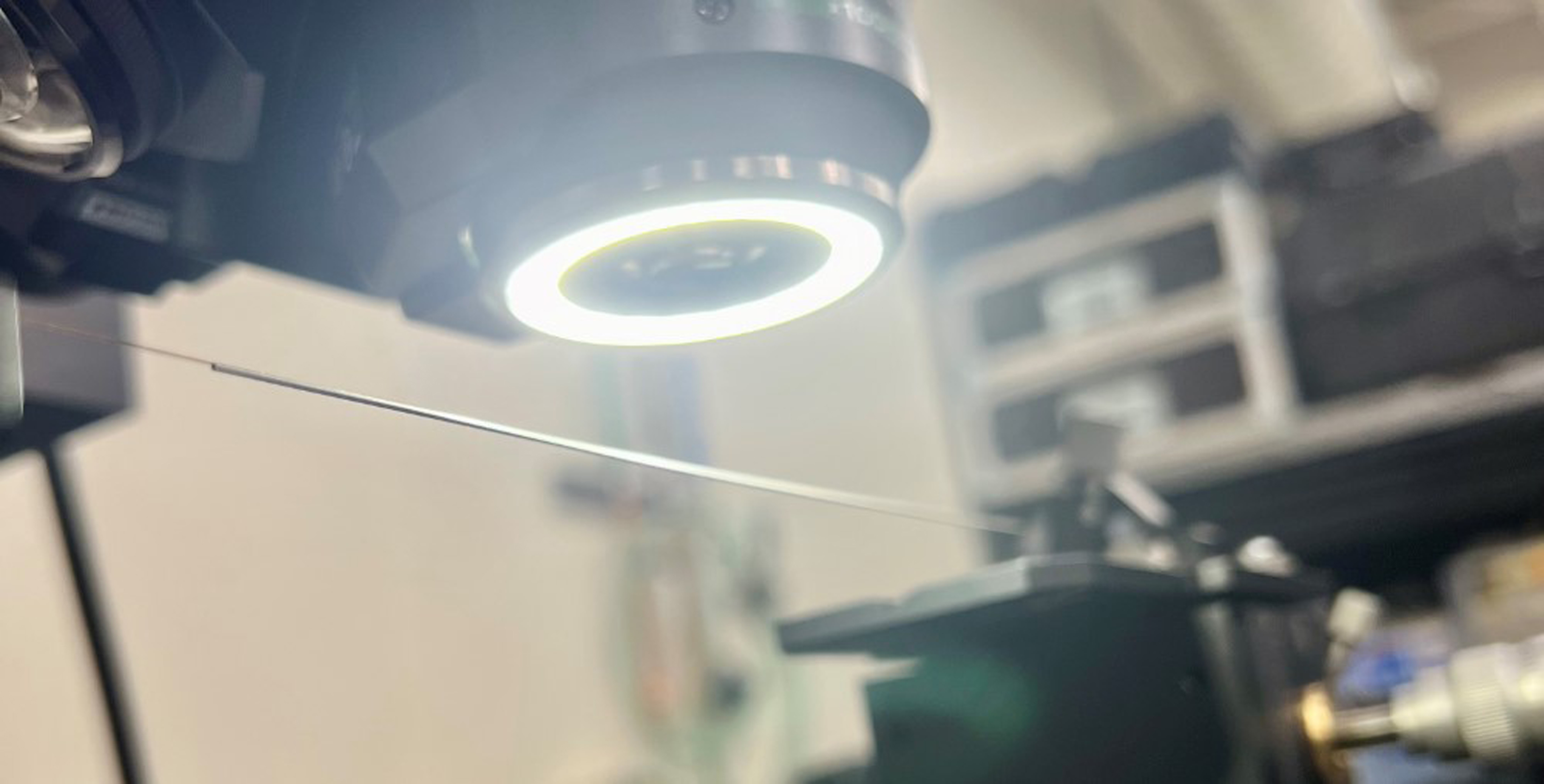 An image of the laser-cut Hypotube (LCHT) with the testing equipment used.