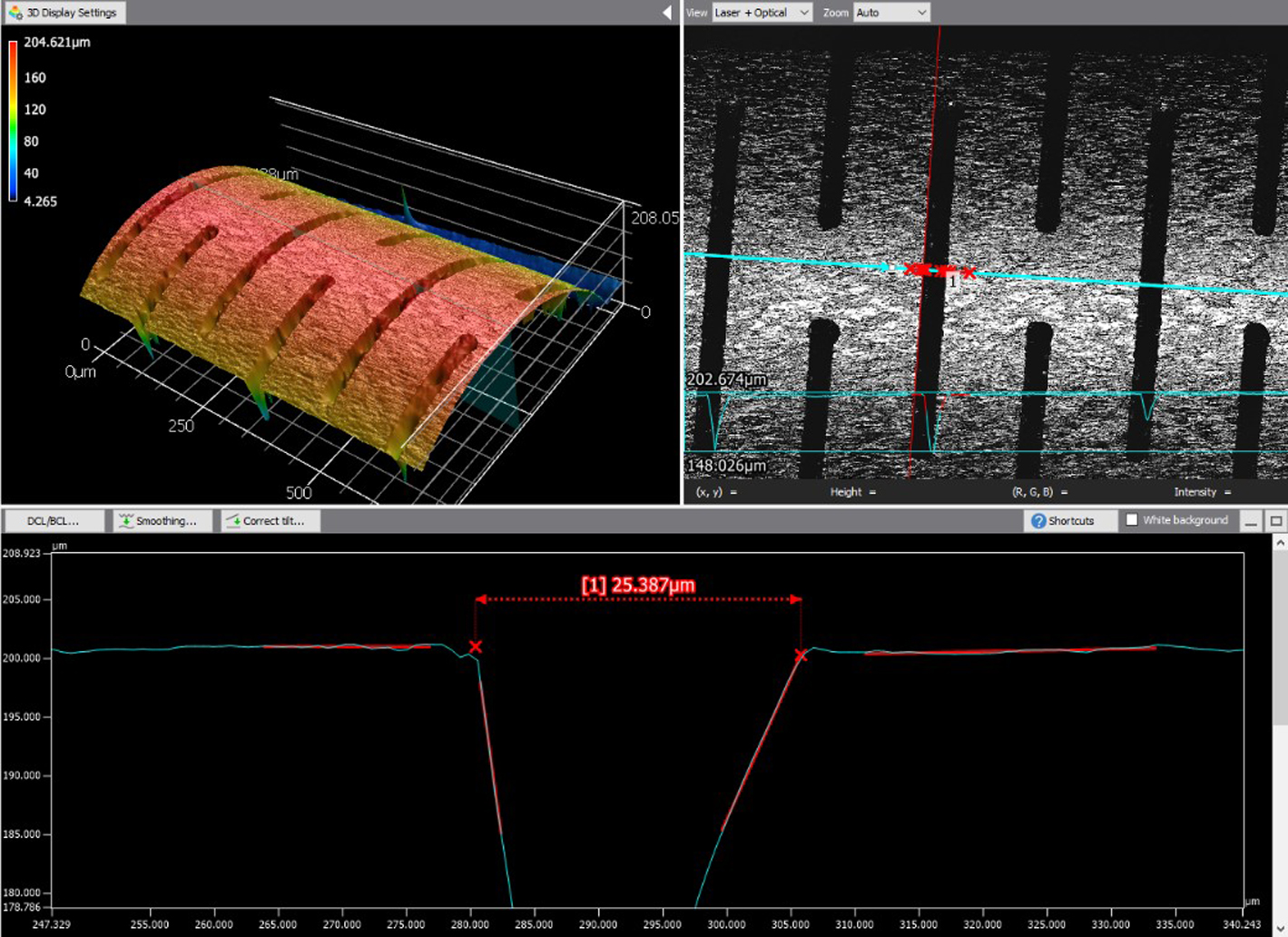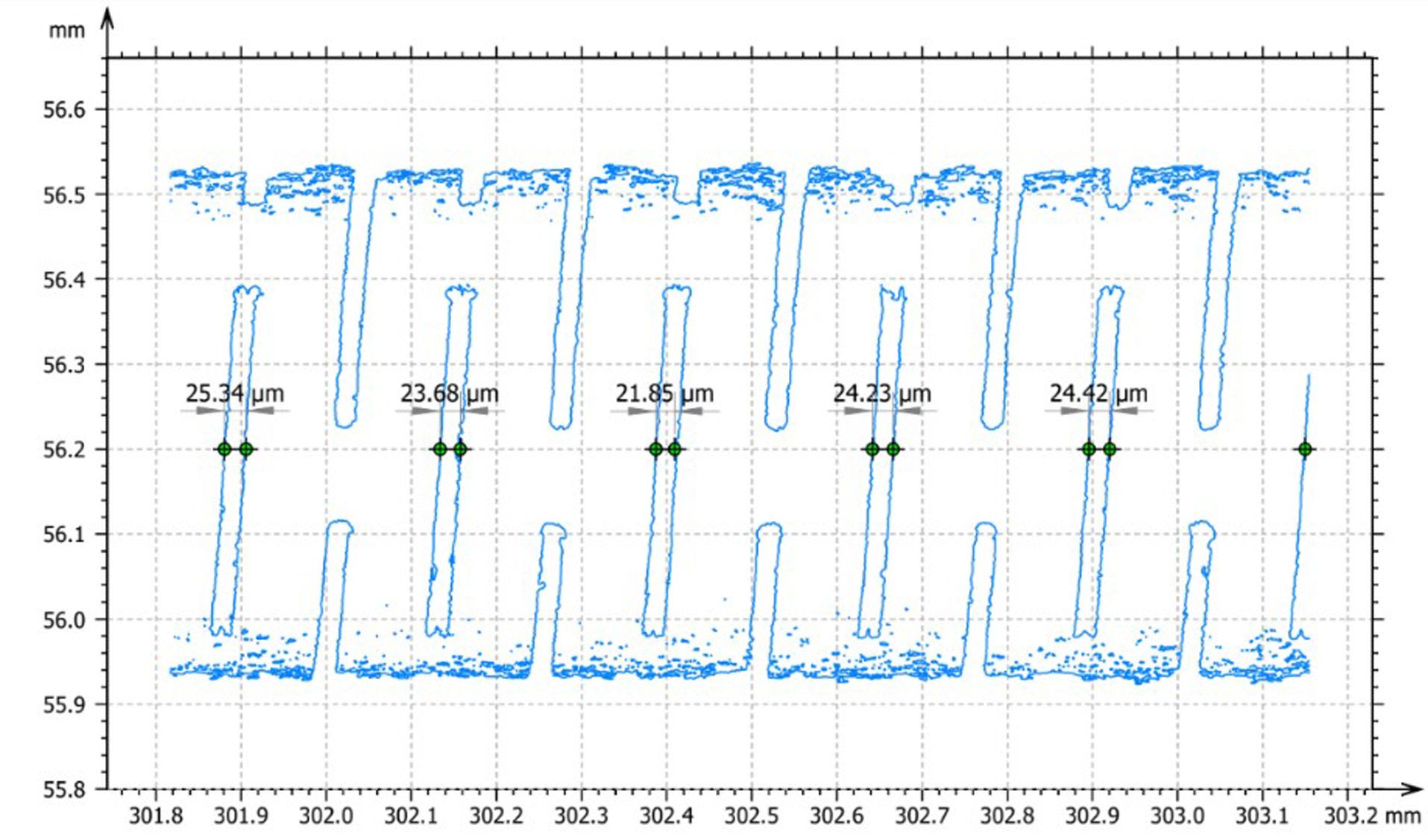 Individual data set from a 3D measurement sensor with 1 µm resolution. The measurements of the cutting width at five defined positions are visible.