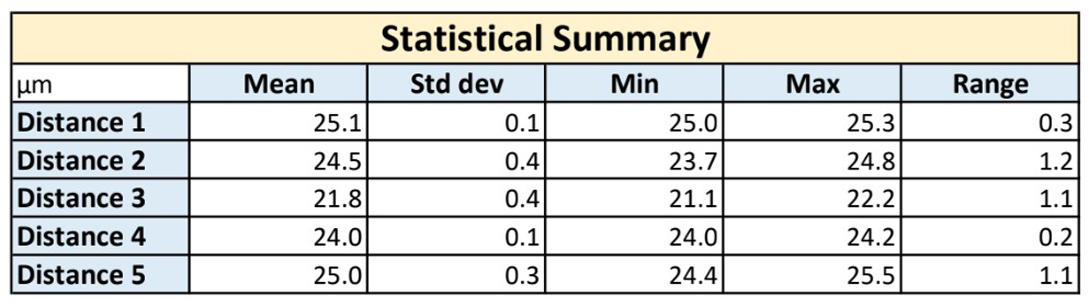 Overview summarising the results of ten separate measurement runs on the same pipe section. The repeatability of the measurement (shown as "Range" in the table) was 1.2 µm in the worst case.