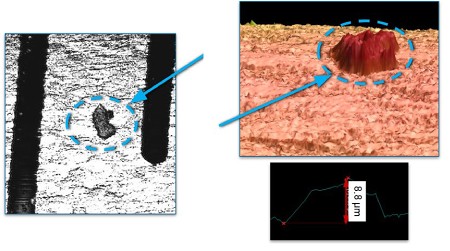 On the right, the 3D data allows the surface to be viewed at an angle, clearly showing that the visible defect is a protrusion. This can be measured and compared with the specifications. In this case, the determined defect height is 8.8 micrometres.