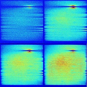 Figure 4: Video of the same solar panels taken with the Raptor Falcon EMCCD camera with variable currents at 20 fps. Again the defective cells are clearly visible. Contrast could be improved using a visible filter.