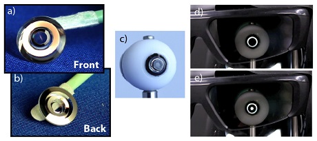 Photo 1: Five views of the switchable telescopic contact lens: a) from front; b) from back; c) on the mechanical model eye; d) with liquid crystal glasses (here, the glasses block the unmagnified central portion of the lens; e) with liquid crystal glasses (here, the central portion is not blocked). Credit: Optics Express.