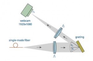 Sticking to their goal of keeping the instrument uncomplicated, Scholten’s team opted for a conventional spectrometer design. “Light from the laser is ‘bent’ by a diffraction grating, i.e., diffracted by some angle where the angle depends on the wavelength. The diffracted light is detected with an imaging sensor; we take advantage of the very high resolution and sensitivity now readily available with inexpensive consumer-grade webcams,” Scholten describes. “We also use a single-mode fiber to couple the laser light into the device — normally a big headache but because the webcam is so sensitive, it is very easy to get enough light through the fiber. The single-mode fiber defines a very small source; we image that source onto the webcam using a couple of good lenses. In combination, the diffracted light becomes a very small spot on the sensor, and with the small pixels we can measure the angle to very high precision.”